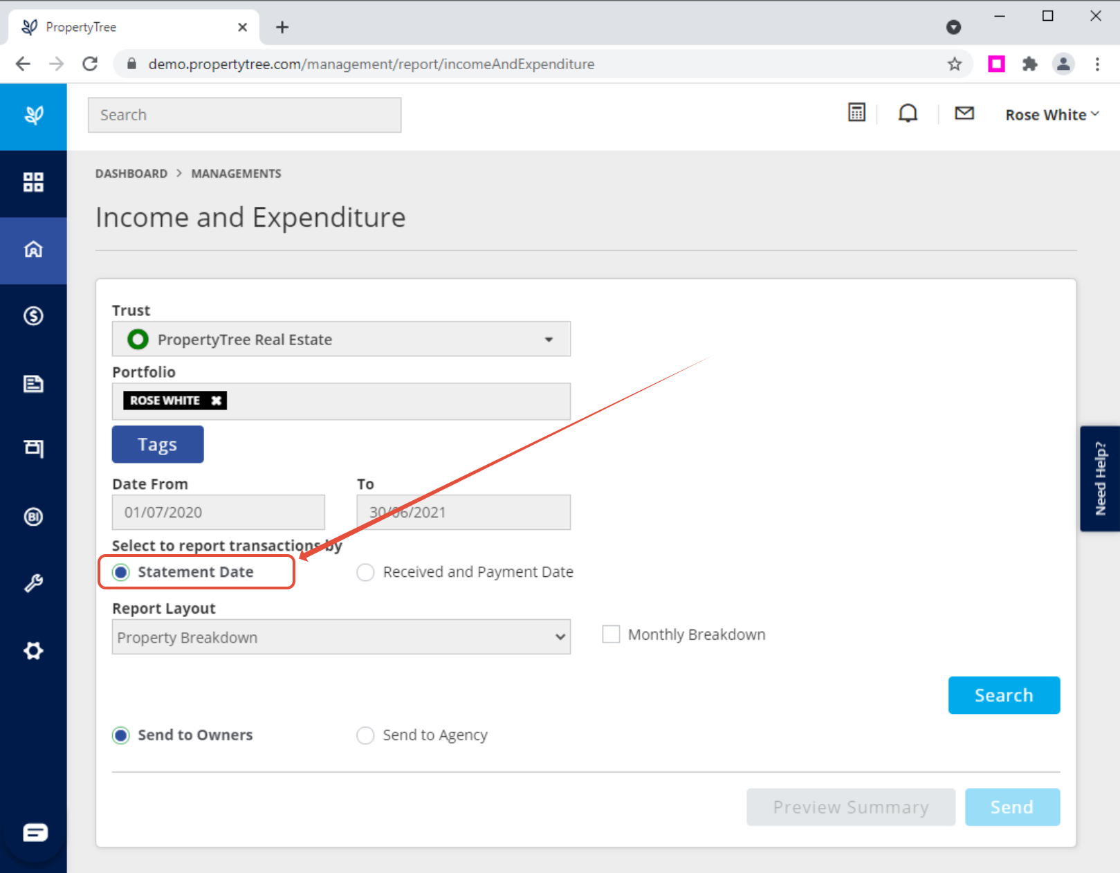 - report transactions by STATEMENT DATE (we don't want Received and Payment Date format)