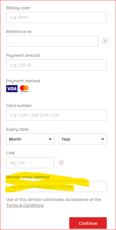 - PAY DEBT NOW will take you to Australia Post bill pay for credit card details.